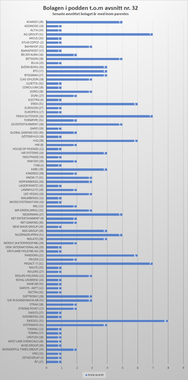Som en liten julklapp kommer här en lista med alla bolag vi tittat närmare på i podden så här långt. Vi har inte tagit med korta omnämnanden under aktuellt eller i allmänna samtal. Sådan koll har vi inte… Hoppas att den kan vara till nytta för någon. Ber om ursäkt för felstavade bolagsnamn. Ska försöka lägga upp den som en egen sida framöver och uppdatera lite då och då.